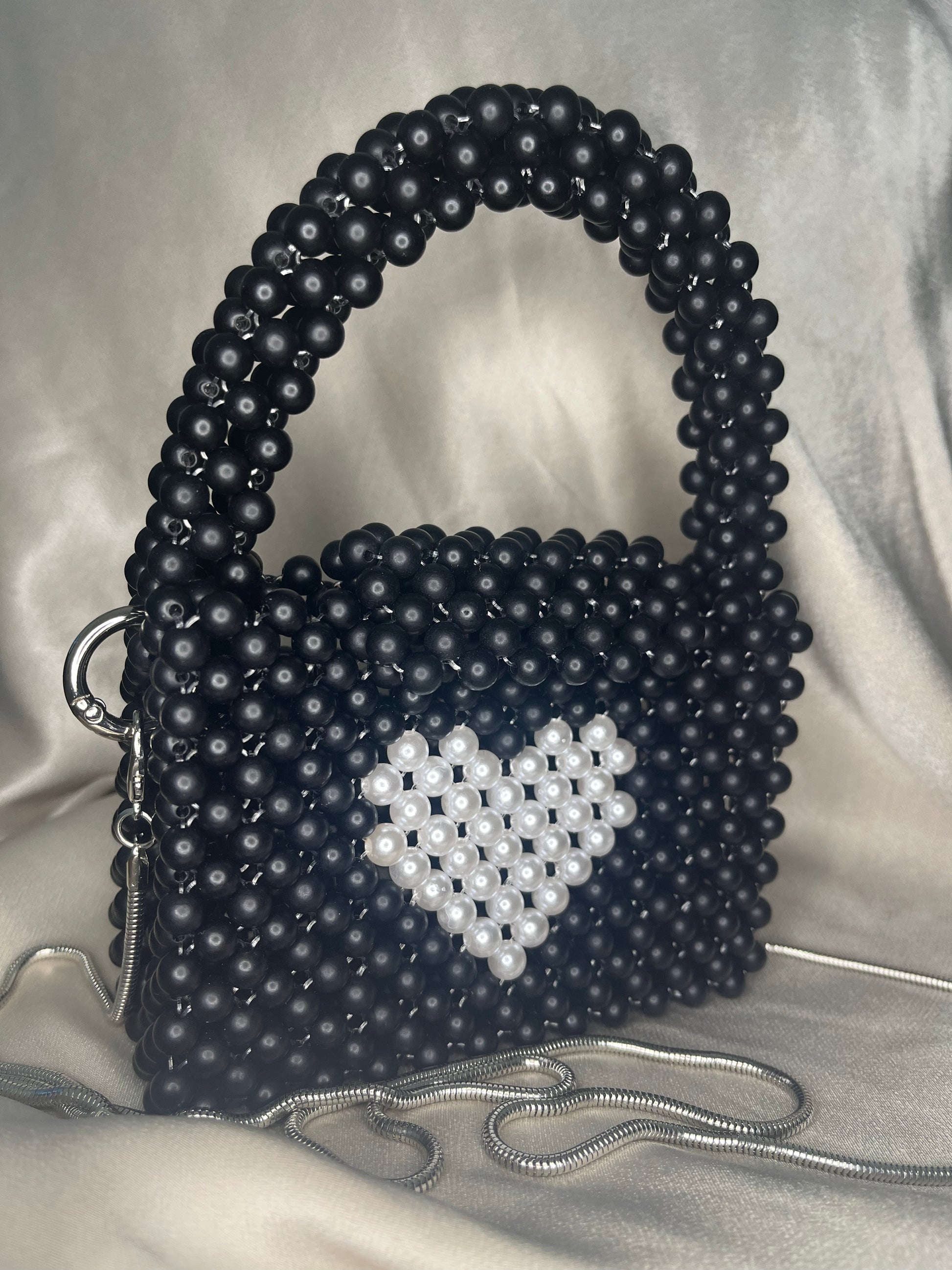 Black matte & white imitation pearl 8 mm beads bag